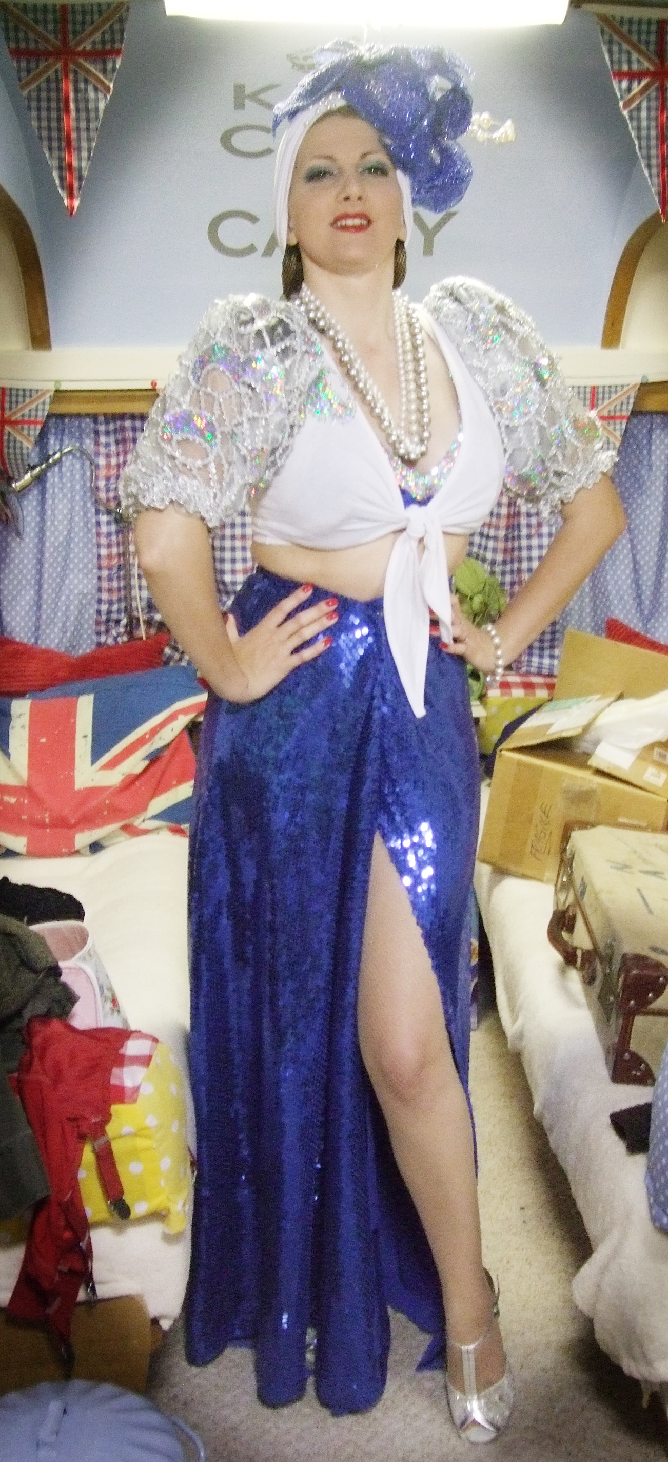 The show seemed to be 3 times bigger than last year, with many more vehicles on show. DJ Woody was back with his awesome music, there was a much better dance floor, Fiona Harrison sang and I also did a singing set each day and debuted my new Carmen Mewanda act in the evening! It went down a storm and I am so glad I altered the act from a fan dance. I was really pleased with the way the costume came out too. It was the first time I had tried to make anything out of sinamay and I was proud of the results for the headdress. The costume itself looks fab but I put on weight since making it last year (I always lose so much weight after the busy season has finished and put it back on again in winter!), so had to alter it at the last minute.