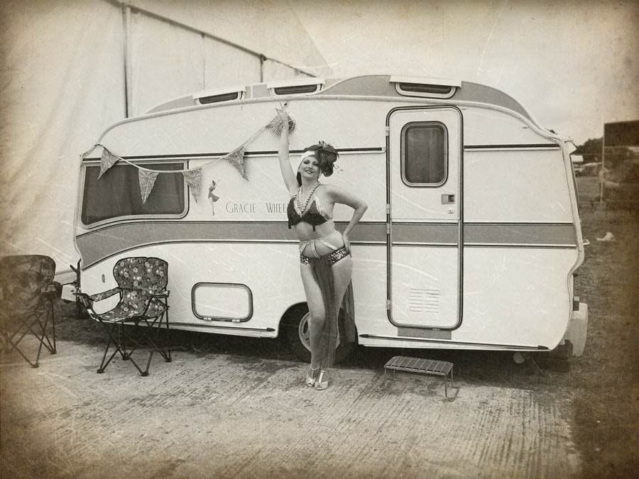Kitten as Carmen Mewanda with her caravan Gracie Wheels