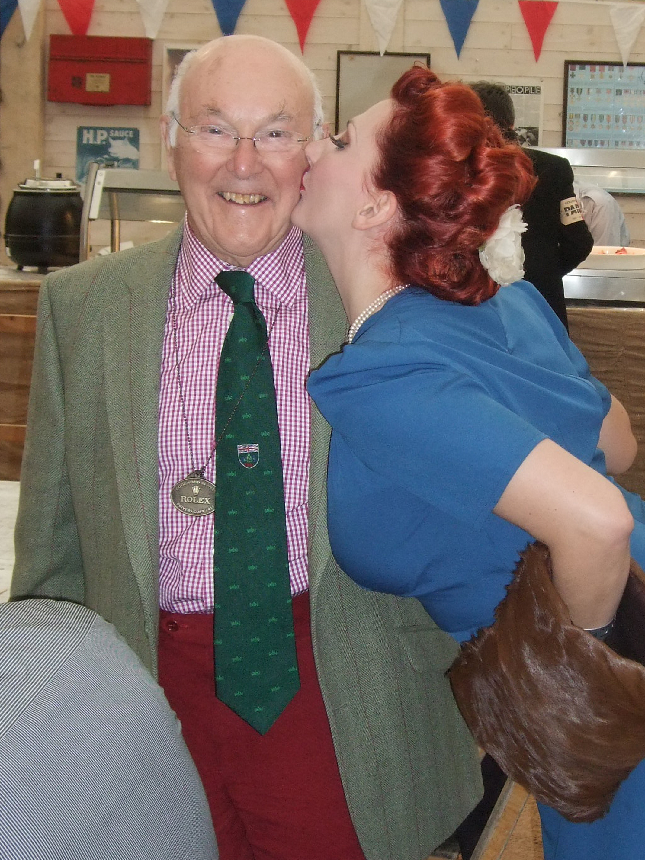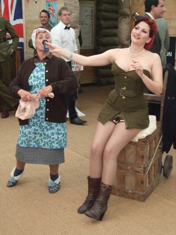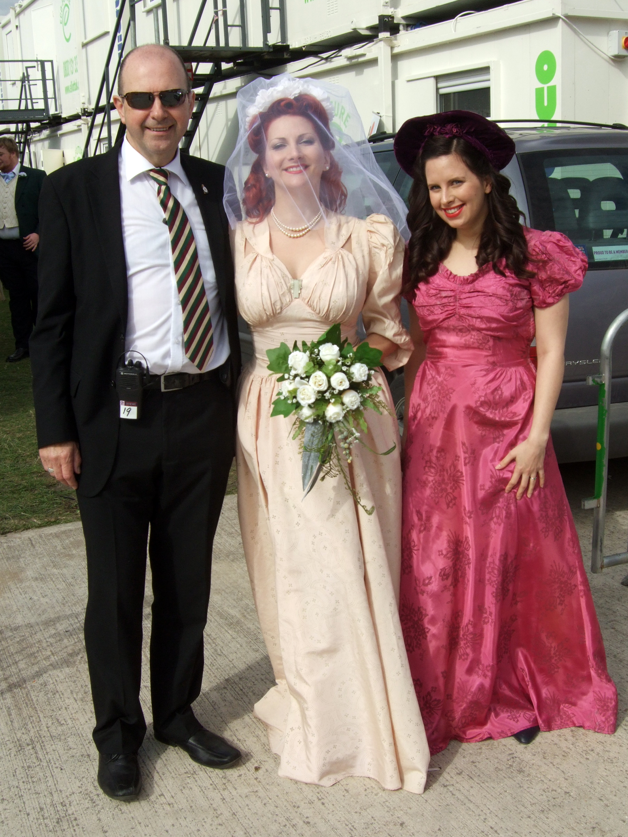 Getting ready for my 1940’s wedding skit with Bill the Bodyguard (left) and my faux bridesmaid (right)