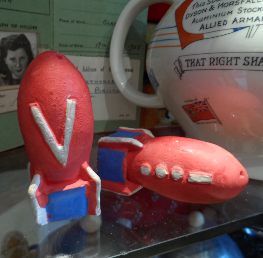 Now to tableware. The flame that sparked my love of these vintage novelties was a set of Victory Bomb salt and pepper shakers. Made out of chalkware or plaster, they are crudely painted in cheerful red, white and blue! How can you not love these? Well…back then, they may have been thought of as tacky and vulgar, but just like Christmas cracker gifts, they were loved for a short period of time, which is what they are all about. I am also now the proud owner of a War Against Hitlerism teapot! I have wanted one of these for as long as I can remember. They were produced for Dyson and Horsfall who surrendered their aluminium teapots to be recycled as allied armaments. It is covered in allied flags and of course the inspiring slogan ‘Liberty and Freedom’ on the other side. The Victory vase (also a favourite bought by our friends!) is another great example and a strong symbol of the time. Everyone recognises a V with …- as the victory sign and it has become a very iconic image. Doesn’t it just fill you with strength and pride just looking at it?