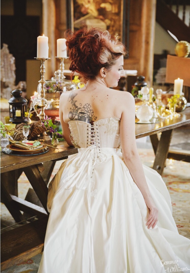 Daisy and Fred created an epic Snitch themed cake, Jamball and Kerry Gold made some wonderful fabric and paper bouquets adorned with charms and Harry Potter references, Jen Hogmany Melchett upcycled some wonderful heels with big velvet bows and Marauder’s Map fabric, All Things Lucy handmade some stunning headdresses, Rosie Red Corsetry brought a mouth watering collection of gowns that I wanted to take home, Sarah Russell was makeup artist and went for a much more natural style than I am used to but super-wild hair, Shelsey Herbs and Flowers brought stunning flowers and foliage, M Style did the theming and there were more people than I can list helping out.