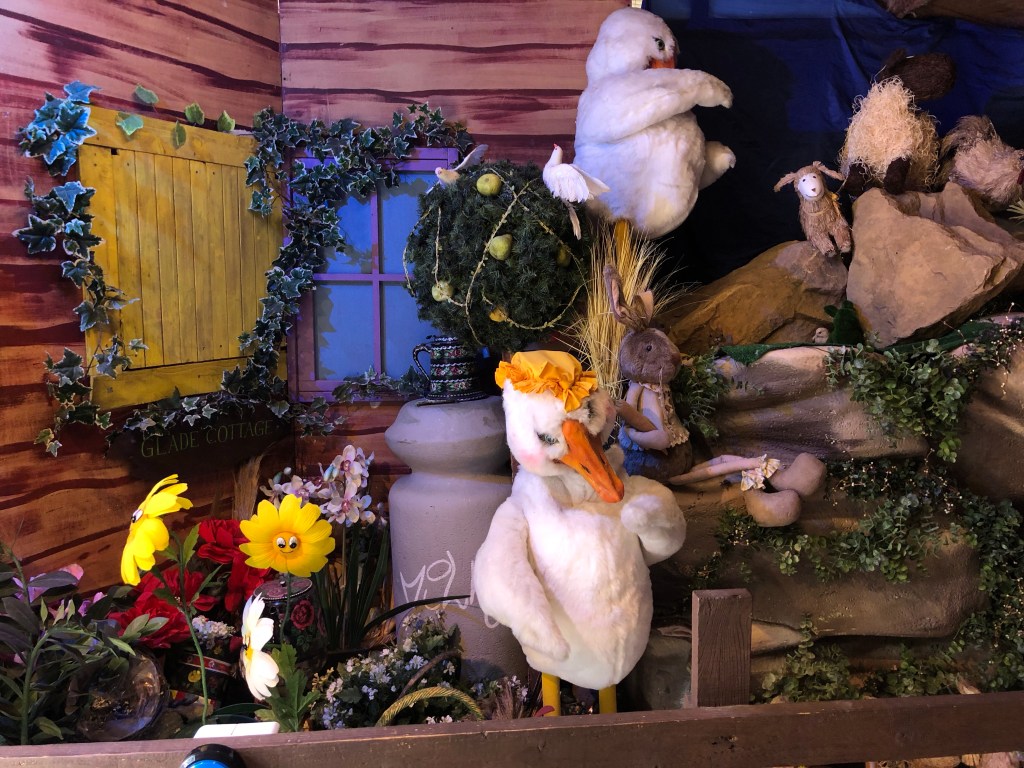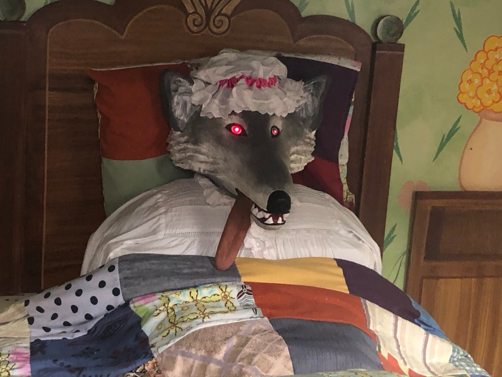 After tearing yourself away from Holstein teat yanking, you then have a corridor of more sheds. This time, you get to gaze through each window like the village weirdo. Press a button to light up each static scene abs hear an excerpt from the fairy tale! From Red Riding Hood’s wolf with glowing red eyes to the pert derrière of Hansel and Gretel’s witch, as she peers into her oven. My personal favourite was sleeping beauty. A beautifully hand painted room sets the scene as you gaze in wonder at Princess Aurora surrounded by her royal mosquito net. The set up was simple. A shop mannequin under a pink bedsheet, but the ‘closed eyelids’ made me giggle uncontrollably. It made me reminisce over my sister’s Bedtime Bernie. Anyone remember those? You would wet her eyes and they would suddenly go a very pale pink to simulate her sleeping. Although no one had licked Sleeping Beauty’s eyes, they had been cunningly painted a flesh tone to mimic eyelids. This may have worked, had they added false eyelashes at the bottom or clever shading, but the overall effect had me wondering whether she would suddenly sit up and start craving the taste of brains. This may have been part of the reason I loved it so much.