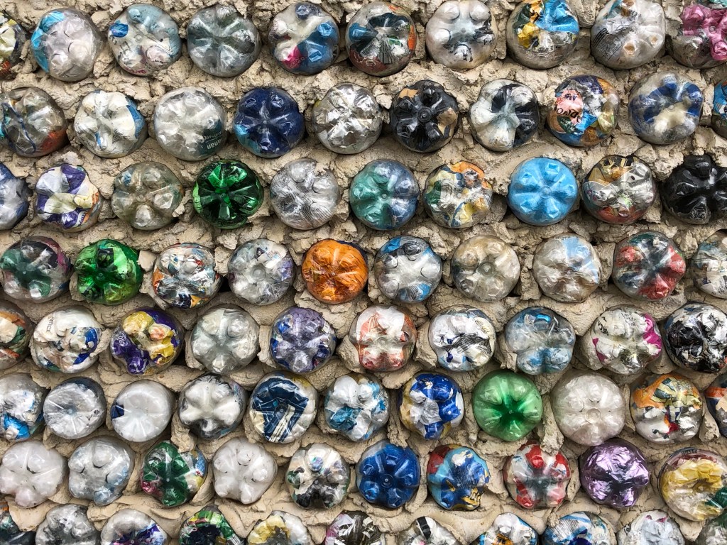 Gorgeous wall created from plastic bottles filled with plastic waste. Colourful and a great idea!