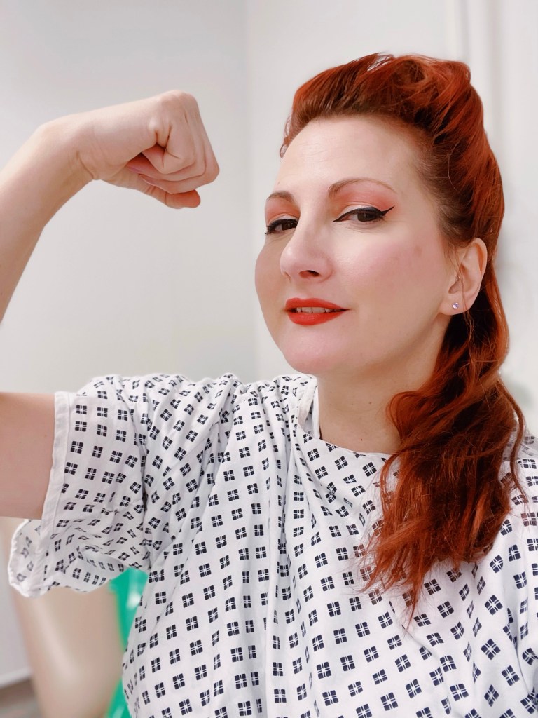 I had a drain fitted, which looked like a vampire’s medallion, but think I pulled it off thanks to the metal staples in my neck, balancing it all out. I was due to go home that day, so celebrated by doing festive makeup and awaiting the nurse at 2pm!