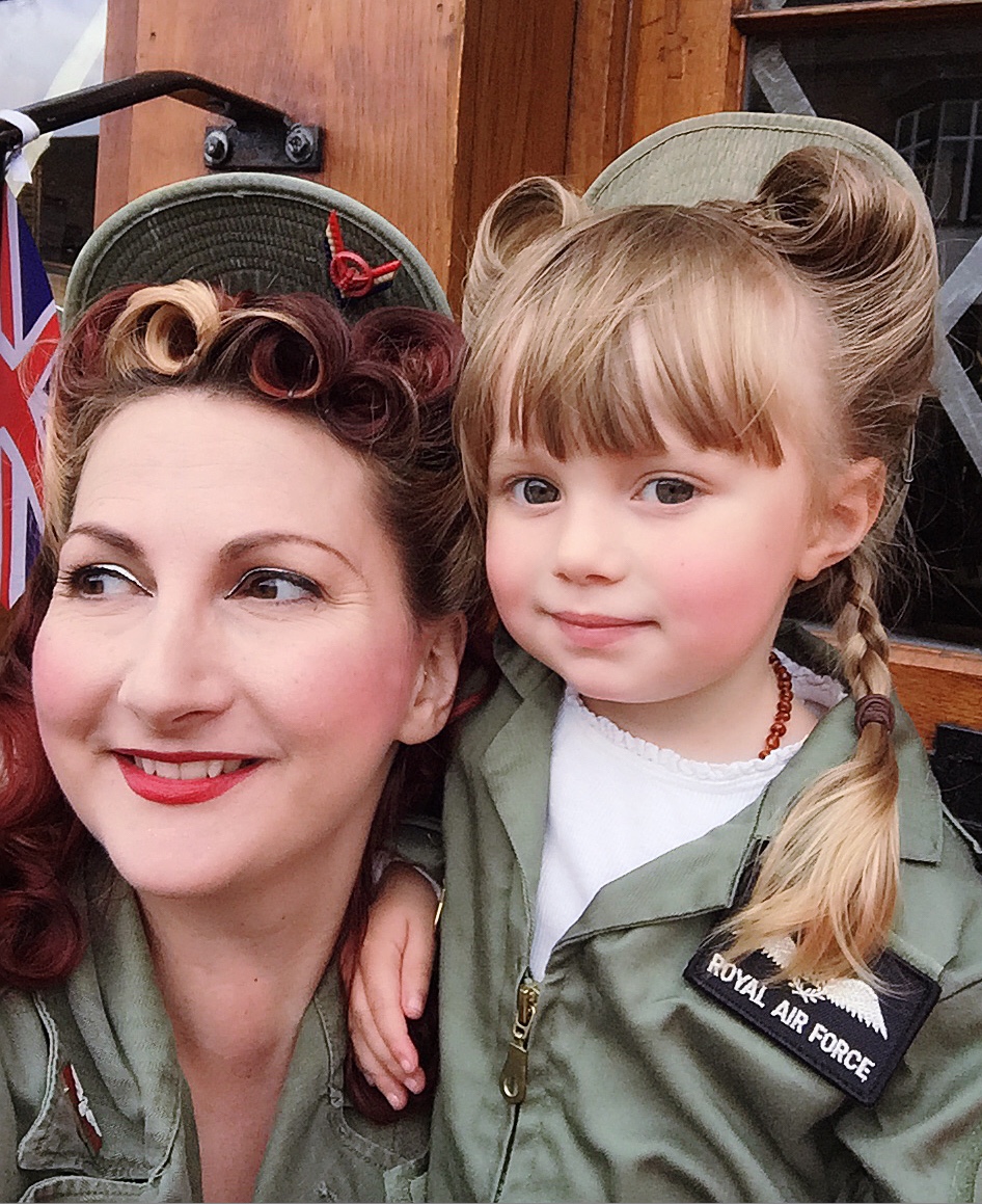 Kitten and RAF crew with one of the model spitfires at War and Peace Revival