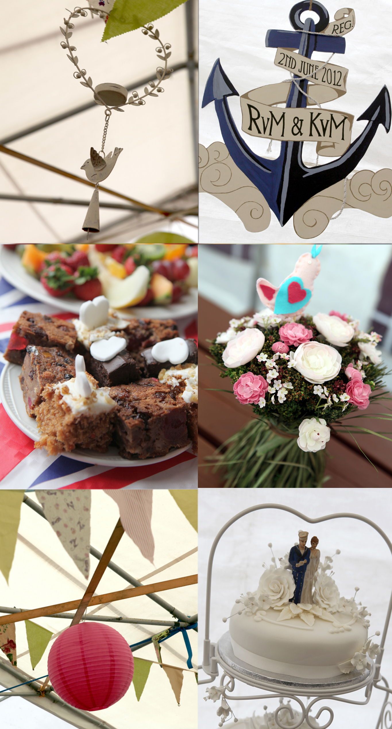 I managed to create 49 metres of bunting out of scrap fabric, quilting fabric, some 1930’s pieces from my Grandad’s house and an old satin blouse (I kept the buttons on in places!). To each pennant we sewed a brass charm. These were cats paws and a ‘K’ for me and a swallow and anchor for Richard!